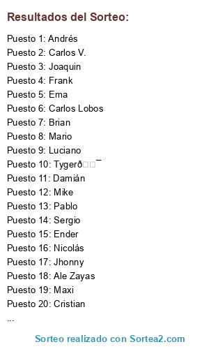 Lista de participantes: Carlos Lobos, Mario, Carlos V., Ale Zayas, Jhonny, Tyger🐯, Joaquin, Mike, Ender, Ema, Brian, Fede, Luciano, Maxi, Cristian, Damián, Frank, Sergio, Andrés, Jesús, Pablo, Fer, Seba, Nicolás.