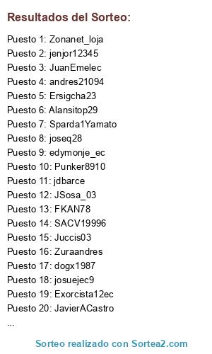 Lista de participantes: edymonje_ec, FKAN78, JuanEmelec, luchi2301, Exorcista12ec, josuejec9, jenjor12345, andres21094, JavierACastro, Punker8910, SACV19996, dogx1987, joseq28, jules6699, Zuraandres, jdbarce, Sparda1Yamato, Zonanet_loja, GOTG_2002, JSosa_03, Ersigcha23, Navas9323, Alansitop29, Juccis03.