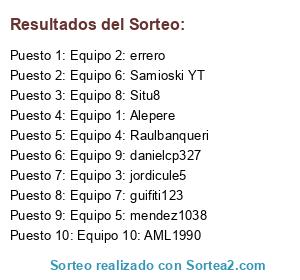 Lista de participantes: Equipo 1: Alepere, Equipo 2: errero, Equipo 3: jordicule5, Equipo 4: Raulbanqueri, Equipo 5: mendez1038, Equipo 6: Samioski YT, Equipo 7: guifiti123, Equipo 8: Situ8, Equipo 9: danielcp327, Equipo 10: AML1990.