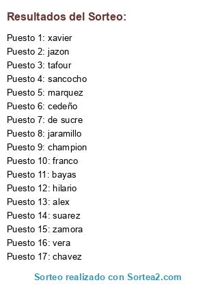 Lista de participantes: chavez, marquez, champion, suarez, tafour, alex, jaramillo, zamora, hilario, jazon, franco, vera, de sucre, cedeño, sancocho, bayas, xavier.
