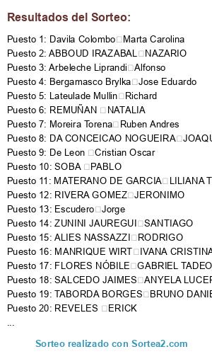 Lista de participantes: ALVES PEREIRA JOAQUIM, PINTO RICARDO MIGUEL, FERREIRA DOS REIS PAULO JORGE, MARTINS SACOTO JOSE MIGUEL, PINTO ALVES CARLOS JORGE, DA CONCEICAO NOGUEIRA JOAQUIN, JORBA COLOMA JAVIER, ALLENDE PINO DAVID, BATISTA TERRONES RAFAEL, MARTINEZ DIAZ SALAZAR DAVID, NAVAS BALLESTEROS ANTONIO, VIANCHA SALAMANCA ERIKA JOHANA, Martinez Caballero MARIA KARINA, MURILLO BELTRAN JULY DAYAN, ATEHORTUA MILTON, LOBATC ESPIÑEIRA REBECA, FERREIRA DE ALMEIDA LUIS MIGUEL, Da Costa Bernardino Ricardo Alberto, GOULART DA SILVA JEAN, MARTINEZ LIMA SILVANA GABRIELA, REVELES ERICK, Desiervi Quiroga Fernando Nicolas, ALVAREZ ANDRES ROBERTO, Mendieta Balserini Lucia, TORRES NUÑEZ ALBERTO, BENITEZ ARAMENDIA SEBASTIAN, BRACHO BORREANI FACUNDO, DUARTE ANDRADA SERGIO FERNANDO, BONELLI VILLAGRAN CAROLINA, NUÑEZ GULARTE ANDREA ALEJANDRA, FIGUEIREDO PEREIRA CAMILA, BATISTA SANTOS MATIAS FEDERICO, PETIT ARAYA JORGE MARCELO, CHAMIZO CARMONA JAVIER, IANNELLO LEANDRO EZEQUIEL, CHIESA FEDERICO, CARBALLO BURGUEZ GERMAN ANDRES, TRAK CARLOS, SARTORIO MARIA, GAVIDIA JESUS, REYNOSO ALEJANDRO, SOBA PABLO, RAINERI IGNACIO, REMUÑAN NATALIA, GRACIA MICAELA, RODRIGUEZ CAMARGO FREDY RICARDO, DE LOS SANTOS LOPEZ MAURICIO FACUNDO, WALDROPH WALFRED, BAZAN MARIA EMILIA, CAVALIERI LOPEZ ELIANA GIANINA, RODRIGUEZ RODRIGUEZ ALVARO GUZMAN, LANDAETA ZEUS, Dardano Eloisa Berriel, Cordoba Matias Ruben, VELAZQUEZ HUGO, Montoya Orlando Toro, Giampietro Aldaves Carlos Sebastian, Nuñez Estellano Gaston, Leiva Duarte Nelida Maria, Delia Suarez katia Silene, Camargo Sopeña Marcelino Edgar, Norbis Larrañaga Maria Alfonsina, De Leon Cristian Oscar, Antonio Olivera Jaime, Bergamasco Brylka Jose Eduardo, Davila Colombo Marta Carolina, Filippa Berazategui Paula, Arbeleche Liprandi Alfonso, Serbali Cappone Virginia, Cabrera Silva Diego Martin, Castillo Fernandez Manuel Belmor, Hernandez Bejarano Ernesto Inti, Moreira Torena Ruben Andres, Corgatelli Geymonat Ives Alain, Garcia Levratto Tatiana, Gonzalez Lookwood Natalia Carolina, Rostan Gonzalez Alvaro Ernesto, Lateulade Mullin Richard, FLORES PRIETO YELITZA, VERA PEREIRA OSCAR, JUAN ORDORICA JESSICA, BORBONET ROLFI ROBERTO, FONTANA LUZARDO CARLOS MARIANO, HERRERO JOSE EDUARDO, RIVERA GOMEZ JERONIMO, ALVAREZ FLORES GUZMAN EDGARDO, CLASTORNIK DREISIS ALEJANDRO, BALSAMO RODRIGUEZ WALTER JONY, PEREIRA ACOSTA ALEJANDRO GABRIEL, Navarro Acevedo Emiliano Federico, ANTUNEZ FERNANDO RAFAEL, GARCIA SARAUZ ROMINA, CANO VAZ MARTIN, SALCEDO JAIMES ANYELA LUCERO, ABBOUD IRAZABAL NAZARIO, RAVERA VALENTINA LONG, PINTO DA SILVA JORGE ALEXANDRE, Garay Curbelo Fernando, SOLLA CRUZ VALERIA CAMILA, TABORDA BORGES BRUNO DANIEL, SERUGA FAGÚNDEZ FACUNDO BREMEN, FLORES NÓBILE GABRIEL TADEO, Moreno Collado Francisco Javier, CACCIALI VOLPI GIANNINA, PEREZ CASTRO LEANDRO MAXIMILIANO, DELIA SUAREZ BRAIAN AGUSTIN, Piran Balcarce Francisco Juan, Silvera Garcia Osvaldo Sebastian, MANRIQUE WIRT IVANA CRISTINA, PETIT ROJAS JOSE MATIAS, Castagnola Pouso Paula Noelia, Carmona Blazquez Alberto, LOPEZ PARARD MALENA, BESACCIA OYARBIDE BLAS ESTEBAN, IRIBARREN SANTIAGO, ROBAINA MEDEROS RONALD, DUGARO QUINTERO MARINO JOSE, PEROLARI RIVERO MAXIMILIANO, LATORRACA CARDOZO RAUL, CABALLERO POGGI JUAN IGNACIO, COHN GASPAR FABIANA, GARCIA TORRES MANUEL, BARBOZA LOZANO GASTON, CASTRO MACIEL BRUNO SANTIAGO, MAIDANA GUILLEN EMANUEL JESUS, ALOY TECHERA LEANDRO FEDERICO, Martinez Reggio Noelia Diamela, Fleitas Ibáñez Judith Camila, PEREZ GONZALEZ DANIEL, ARAMBILLET MAUCCIONE ALFREDO NELSON, NEGRIN MONTERO MANUEL, LAMAS MACHADO ADRIANA LORENA, MATERANO DE GARCIA LILIANA TAHINA, DEARMAS SANTIAGO, ZUNINI JAUREGUI SANTIAGO, SOSA VIDARTE ANA VICTORIA, GIMENEZ SILVA FLAVIO DAMIAN, ANDRADE VIRGUEZ PARAMACONI HAXIMU, PINTO ROJAS OTONIEL HUMBERTO, LEAL MORANTES ELQUIN MAURICIO, ROVETTA VIRE MARIANGEL, HERNANDEZ PADILLA JOSE RAMON, MUNIZ BERÓN JORGE MARTÍN, CASTRO COITIÑO MARCOS ALEJANDRO, BADO VAZ JOSEFINA, MACCHI CABRERA ROBERT RAMÓN, GONZALEZ JUEZ MARIA, FRANCO MOLINA JOAQUIN IGNACIO, AYUSTO CARNEIRO NICKY JOEL, RINCON CASTILLO FELIPE SANTIAGO, TEPERINO SANCHEZ YENIFFER JOHANA, PEÑA ZANGARO DIEGO ALBERTO, DE CLERCK SILVEIRA LEANDRO, SUAREZ SANTANA DANIELA ROCIO, ALIES NASSAZZI RODRIGO, GAY NIETO CESAR, FERNANDEZ ROMINA, Escudero Jorge, TORRES NUÑEZ Juan Manuel.