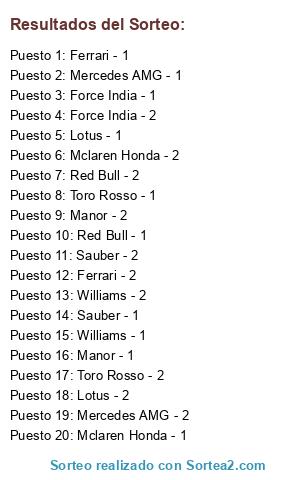 Lista de participantes: Mercedes AMG, Red Bull, Ferrari, Williams, Force India, Toro Rosso, Sauber, Lotus, Mclaren Honda, Manor.