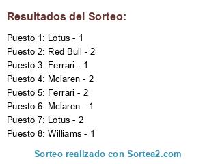 Lista de participantes: Ferrari - 1, Ferrari - 2, Williams - 1, Williams - 2, Force India - 1, Force India - 2, Mclaren - 1, Mclaren - 2, Lotus - 1, Lotus - 2, Toro Rosso - 1, Toro Rosso - 2, Red Bull - 1, Red Bull - 2.
