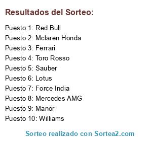 Lista de participantes: Mercedes AMG, Red Bull, Ferrari, Williams, Force India, Toro Rosso, Sauber, Lotus, Mclaren Honda, Manor.