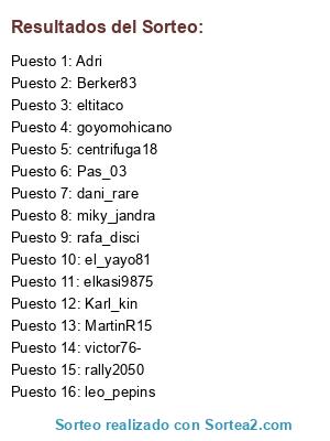 Lista de participantes: dani_rare, Karl_kin, centrifuga18, MartinR15, leo_pepins, el_yayo81, rally2050, rafa_disci, eltitaco, goyomohicano, miky_jandra, elkasi9875, Adri, Pas_03, Berker83.