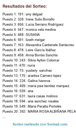 Lista de participantes: 1 Judith C. Jorge Fuentes, 2 Yosune González Román, 3 Diana Salas, 4 Belinda Benitez Hernandez, 5 Belinda Benitez Hernandez, 6 Belinda Benitez Hernandez, 7 Belinda Benitez Hernandez, 8 Belinda Benitez Hernandez, 9 Belinda Benitez Hernandez, 10 Belinda Benitez Hernandez, 11 Belinda Benitez Hernandez, 12 Delia Serrano Gonzalez, 13 Leticia Suarez Goncalves, 14 Katarzyna Debowska, 15 Adriana Garcia, 16 Débora Torres Belmonte, 17 Jessica Nolasco, 18 Jessica Nolasco, 19 Noelia Corripio, 20 carla bastias, 21 alba romero sanchez, 22 celia garcia pliego, 23 Nuria Reche sanchez, 24 ELENA RUIZ, 25 monica grau seto, 26 MARIA SILVESTRE ESTEVE, 27 Eida Salazar Carballo, 28 MARIA BABARRO, 29 mar ortega robles, 30 Ana Azahara Badás Lorente, 31 Sandra Calle Martin, 32 Silvia Ayllon Colomar, 33 CAROLINA MARTINEZ VI O, 34 barbara garcia, 35 Laura Pérez Veguillas, 36 Laura Pérez Veguillas, 37 Lidia Blanco Castellano, 38 Kirsy Gonzalez, 39 Jenifer Moyano Barroso, 40 mikele cendoya gil, 41 Clara Pampillón, 42 Susana Muñoz Moreno, 43 miriam ortega leal, 44 Marta Canedo Arnedo, 45 marta Fernández Calderón, 46 Silvia Ibáñez Esteban, 47 Nieves Hidalgo Pérez, 48 Beatriz, 49 Ana Belén Jódar Ruiz, 50 naiara martin segura, 51 Arantza Ordoñez del Rio, 52 Maria Elena De Benito Calle, 53 Ana Rosa Perez Lopez, 54 Sergio Abad Martin, 55 Sergio Abad Martin, 56 Ana González, 57 Darcya Ramos perez, 58 Lorena Bonsegundo, 59 erica Gonzalo ordoñez, 60 Esther Pineros, 61 remedios rios veredas, 62 PAULA GARCIA, 63 angelica, 64 laura, 65 Judit Gracia Gil, 66 Marta Canedo Arnedo, 67 marta gomez lucea, 68 darling arredondo perez, 69 Mª Consuelo Rial Lorenzo, 70 VERONICA, 71 Anna Buixa, 72 Sonia Barbero, 73 belen diaz pico, 74 sandy Lizbeth huerta lópez, 75 yusbely sanchez, 76 Lara Fernandez, 77 Aranzazu Castillo, 78 Samira El moussaoui, 79 Maria Gascon Luque, 80 María Aguilera, 81 SUSANA, 82 angeles moncada saura, 83 samanta cintas figueras, 84 Noelia Blanco Escobar, 85 MARIA ROSA ALBIÑANA PELAEZ, 86 maria jose benitez marquez, 87 laura muñoz rodriguez, 88 Pilar Blázquez, 89 Marta Villalba, 90 vanesa martinez, 91 CARMEN ADAMUZ ALCANTARA, 92 carmen raggio ruiz, 93 Jazmín salinas, 94 Verónica Pardo, 95 Mercedes Escusol, 96 Judith Perez Diaz, 97 mireia lorente sevilla, 98 liliana perez trejo, 99 Susana Arones, 100 Lucia Marquina Ballesteros, 101 Elena Roxana Caritescu, 102 Ana Coronado Saravia, 103 Miriam Purroy Ruiz, 104 PILAR BOUZA GUERREIRO, 105 PILAR BOUZA GUERREIRO, 106 maritza tatiana tufino sanmartin, 107 pepa pardo palenzuela, 108 Ana elena Requejo lopez, 109 Carolina Agulló García, 110 Eva maria Calleja Alonso, 111 Georgina Sanchez colome, 112 Estibaliz Alvarez, 113 verenice mendoza, 114 vanessa lc, 115 Adina mihaela Comsa, 116 fabiola pallero calderon, 117 Alexandra Lara, 118 Verónica Fernández Belmonte, 119 Alexandra Vela González, 120 Sandra María Márquez, 121 lara pasantes campaña, 122 Eva Llabres, 123 Raquel Cabezas Alcaide, 124 Sahara Hernandez, 125 Tania Rodríguez Velasco, 126 Georgina Sanchez colome, 127 anyira elena jimenez peña, 128 Viviana Muñoz, 129 Angela Jimenez Gata, 130 Alina Ciocan, 131 Sergio Abad Martin, 132 Naia Mendia Zarraga, 133 mari angeles, 134 sonia Sanchez Montemayor, 135 Angie Mileydi Arias Ayala, 136 Irene Berenguel, 137 Clara Sanroman Costas, 138 juliana perez, 139 ana, 140 Maria Jose Lázaro, 141 EVA MARIA ALVAREZ, 142 saray gomez pla, 143 NURIA, 144 Beatriz Alvarez pombal, 145 Estibaliz Alvarez, 146 Marta Vera Lorenzo, 147 eva González medina, 148 katha acha, 149 Luciana Vega, 150 Rut Cabrera Ramos, 151 maria jesus Arevalo cruz, 152 cristina peinado carrasco, 153 Alba Ortiz Perez, 154 Eli Yáñez, 155 susana aloy, 156 isabel Rodr, 157 any delgad, 158 Maria Lafuente Aballe, 159 Ana Ramos, 160 Rocío de la Aurora Martín Gómez, 161 PILAR BOUZA GUERREIRO, 162 Diana Fdez, 163 Alexandra Cardenete Santacreu, 164 Alexandra Cardenete Santacreu, 165 Alexandra Cardenete Santacreu, 166 silvia montuenga sanz, 167 Nahima Parra Gil, 168 Mª ISABEL, 169 Cristina Garcia Perez, 170 Ana Mordi, 171 Sara Blanco, 172 Sara Blanco, 173 Laura De Esteban Hernández, 174 Marta Quesada Palmer, 175 arantxa Carnero lopez, 176 Carmen Maria, 177 Vanesa Ballesteros Cervantes, 178 Mari Sanchez artero, 179 Zoraida Saavedra, 180 Sara Blanco, 181 Azucena Carrasco, 182 PILAR BOUZA GUERREIRO, 183 Noemy Sanchez, 184 Virtudes Pérez virues, 185 Rut Cabrera Ramos, 186 MAITE, 187 Jessy Guzman, 188 Estefania moya, 189 Toñi Martínez García, 190 Emma De vicente Cristóbal, 191 any delgad, 192 Virginia Vázquez, 193 Sara Addi, 194 Sara Addi, 195 Noemy Sanchez, 196 Gemma Girona Girona, 197 Jessy Guzman, 198 Emma De vicente Cristóbal, 199 PILAR BOUZA GUERREIRO, 200 Elena Grande Blanco, 201 MARIA DEL MAR RODRIGUEZ, 202 Erika Rodriguez Bello, 203 Brigitte Istan, 204 Maria jose Sandoval guerrero, 205 Jessy Guzman, 206 Elsa Flores Alborch, 207 amaya Estrella García, 208 Alejandra Peñaloza vera, 209 Alma Anton Juarez, 210 Maria Gomez Bragado, 211 miriam pregal duran, 212 Judith C. Jorge Fuentes, 213 Lucía Martínez Alcalde, 214 anabel arboleda, 215 Beatriz Luque Santiago, 216 Estibaliz Alvarez, 217 Galina Ivanova, 218 Galina Ivanova, 219 Isabel Pérez Aranda, 220 Isabel Pérez Aranda, 221 Isabel Pérez Aranda, 222 Isabel Pérez Aranda, 223 Isabel Pérez Aranda, 224 Galina Ivanova, 225 Galina Ivanova, 226 Noelia Corripio, 227 Galina Ivanova, 228 Galina Ivanova, 229 Galina Ivanova, 230 ELENA RUIZ, 231 ELENA RUIZ, 232 monica grau seto, 233 Laura Garrido Llarandi, 234 Laura Garrido Llarandi, 235 Galina Ivanova, 236 CARMEN ADAMUZ ALCANTARA, 237 Eida Salazar Carballo, 238 MARIA SILVESTRE ESTEVE, 239 Clara Pampillón, 240 MARIA SILVESTRE ESTEVE, 241 mar ortega robles, 242 Ana Azahara Badás Lorente, 243 Silvia Ayllon Colomar, 244 CAROLINA MARTINEZ VI O, 245 Sandra Calle Martin, 246 Sandra Calle Martin, 247 Laura Pérez Veguillas, 248 Anna Borràs Sanchis, 249 ROCIO PEREZ PEREZ, 250 CAR