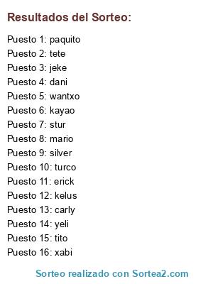 Lista de participantes: wantxo, paquito, turco, tito, mario, silver, tete, xabi, stur, kelus, carly, dani, kayao, jeke, yeli, erick.