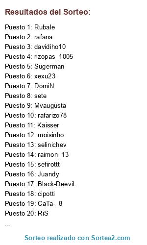 Lista de participantes: RiS, ZeQuI, CaTa-_8, assalito, Juandy, moisinho, cipotti, sete, brayan, Gores19, alicate9, Gutistas, rubeen, cortex, fer_1980, angelcop1983, sefirottt, Perdy_trs, Makiki, luigi carras 89, iru, Fortopeta, lolazo, ciezano10, Francis15, Hybrid, hintoni, rafana, fuentesiko, selinichev, raimon_13, CA_el_santo, toor89, Kaisser, JAS_73, lucensinho_10, shanero, davidiho10, Sugerman, osvaldiito, maykelillo9, mescamilla, ivi_zizou_10, roqueluis, nesok17, eriko23, deiviz81, JosePolo, Mvaugusta, Black-DeeviL, eL_PeLuSa_, DomiN, rivaltales, CA_Granmago, rafarizo78, xexu23, burni, rizopas_1005, Rubale, Gallato, titi_axel_14, _Gatsu_, jpc_89, litoo.