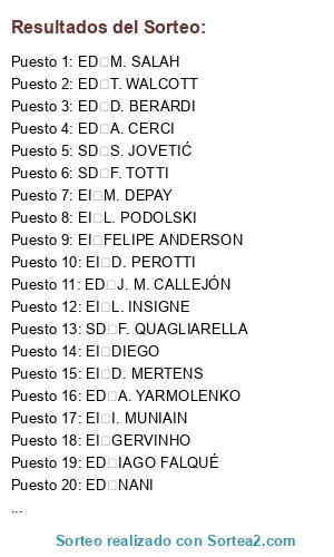 Lista de participantes: EI D. MERTENS, ED J. M. CALLEJÓN, EI M. DEPAY, ED M. SALAH, SD F. TOTTI, SD F. QUAGLIARELLA, ED NANI, ED J. FARFÁN, SD G. ROSSI, ED K. MIRALLAS, EI GERVINHO, EI D. PEROTTI, EI DIEGO, ED QUARESMA, SD J. MÉNEZ, SD R. PALACIO, SD E. LAVEZZI, ED PEDRO, ED IAGO FALQUÉ, EI L. INSIGNE, EI L. PODOLSKI, ED T. WALCOTT, SD S. JOVETIĆ, ED A. YARMOLENKO, ED A. CERCI, EI I. MUNIAIN, ED J. ITURBE, EI A. SCHÜRRLE, EI FELIPE ANDERSON, ED D. BERARDI.