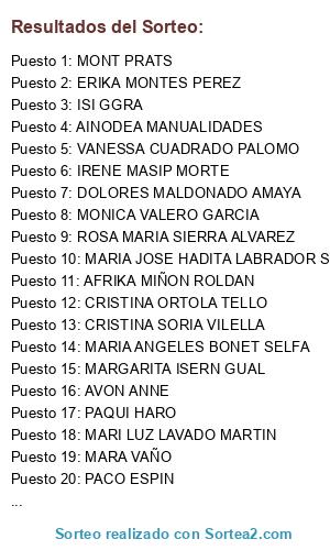 Lista de participantes: AFRIKA MIÑON ROLDAN (2 participaciones), AINODEA MANUALIDADES (3 participaciones), AMPARO FERNANDEZ ALONSO, ANA BERTOL, ANA C ORT, ANA ESPEJO, ANTONIO FERNANDEZ, ANTONIO MAERA MIÑON PORTILLO, ANYKA SANCHEZ MNZ, ARIAS ROJAS, ASCENSION GARCIA FELIPE, AVON ANNE(2 participaciones), BEGOÑA C ORTEGA(2 participaciones), BLANCA RODRIGUEZ(3 participaciones), CAMPANILLA VA, CARI VALERO BALDO, CARMEN CONTRERAS, CARMEN GELABERT PERELLO, CARMEN GOMEZ DALMAU(2 participaciones), CATI LOPEZ GOMEZ, CHARO ROMERO ALVAREZ(2 participaciones), CONCHI MARTIN LOPEZ, CRISTINA AÑON RODRIGUEZ, CRISTINA ORTOLA TELLO, CRISTINA SORIA VILELLA(2 participaciones), CRISTINIKA MARQUSLU, DOLORES MALDONADO AMAYA(2 participaciones), ELENA FERNANDEZ ROZA, ELIS VM, ENCARNI F. ESTEVEZ, ERIKA MONTES PEREZ, ESTEFANIA LEON MORENO, ESTHER ABELLAN(2 participaciones), EUGENIA JORGE BARTUAL, FIELTRO FELT FELTRO FLANEL, FINA BENAVIDES(3 participaciones), FLOR BG(2 participaciones), GLORIA MIGUELEZ, GLORIA URQUIDI(2 participaciones), IRENE MASIP MORTE(3 participaciones), ISABEL TEIS TARINAS, ISI GGRA, JAVIANDSANDRA VILLAMANTA, JENNIFER BONILLA PIZARRO(2 participaciones), JOSE RAMON GONZALEZ VENTURA, KATERINA KNYAZHECHENKO, KELA DE ESTRADA(2 participaciones), KIRIKOSAS MADEHEADS, LEO HABA, LOLI GUILLEN, LOLI SIMON, LORELAY YO(2 participaciones), LORENA MUÑOZ HEREDIA, LOS TRAPITOS DE ESTHER, LOURDES GOMEZ CASTAÑO, LUISA MENARGUES, MANUALIDADES BLUESTAR, MANUEL ROMERO DIAZ, MARA VAÑO, MARGARITA ISERN GUAL, MARI LUZ LAVADO MARTIN, MARIA ANGELES BONET SELFA, MARIA AURORA CUESTA VALLE(2 participaciones), MARIA DEL CARMEN HERNANDEZ MENDEZ, MARIA JOSE HADITA LABRADOR SAEZ, MARIAL CRISTOBAL(3 participaciones), MARISA FORNIELES, MARISA PEREZ GONZALEZ, MARISOL HDEZ GARCIA, MARTA ALONSO GARCIA, MARTA GUERRERO, MARTA MIGUELEZ CHACON(2 participaciones), MARY MARINELA, MARY SANTO, MELODIE HUEMES ALVAREZ, MONICA VALERO GARCIA, MONT PRATS(2 participaciones), NAGORE AROSTEGUI ROJO(4 participaciones), NATALIA RODRIGUEZ TAPIZ, NOAH FERTIN, PACO ESPIN(2 participaciones), PAKYTA MENDEZ LOPEZ, PAQUI HARO(2 participaciones), PAQUI SANCHEZ MENDEZ(2 participaciones), PAQUITA ALVAREZ ALFARO, PATRICIA FERNANDEZ GONZALEZ, PEDRO R. HURTADO CHICHARRO, PILAR CASTILLO PORRAS, PRADO MIGUELEZ(5 participaciones), RAQUEL BUENO(2 participaciones), RAQUEL DURA, RAQUEL VIEJO, RMARIA CAMACHO(2 participaciones), ROCIO GARCIA SERRANO, ROSA MARIA GARCIA, ROSA MARIA SIERRA ALVAREZ(4 participaciones), ROSA PLAZA IGLESIAS, ROSER SOLSONA VILAMAJO, SANDRA CASTAN HERNANDEZ, SANDRA MELERO, SARA ASIVABIEN, SARAH MARIA, SILVI CARMONA, SOLEDAD RODRIGUEZ LOPEZ(3 participaciones), SONIA BARDON GONZALEZ, SONIA MENDEZ RODRIGUEZ, SONIA TORRES, SOPHIA SANCHEZ PEÑA, TANIA FERNANDEZ GOMEZ, VANESA BATALLER CARRASCAL, VANESA CASTAÑEDA(2 participaciones), VANESSA CUADRADO PALOMO(3 participaciones), VERONICA GOMEZ, YOLANDA OLIVA, YOLI OLID(2 participaciones).