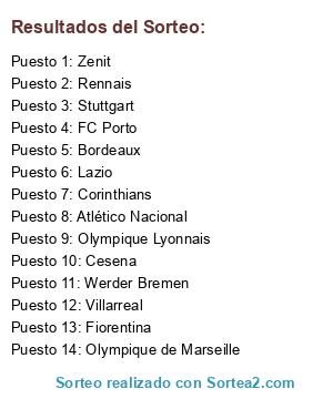 Lista de participantes: Werder Bremen, Lazio, Rennais, Zenit, Fiorentina, FC Porto, Cesena, Olympique de Marseille, Corinthians, Stuttgart, Bordeaux, Villarreal, Olympique Lyonnais, Atlético Nacional.