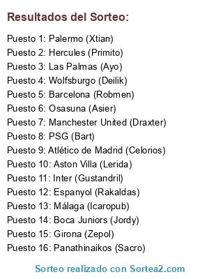 Lista de participantes: Inter (Gustandril), Palermo (Xtian), Málaga (Icaropub), Barcelona (Robmen), Wolfsburgo (Deilik), Atlético de Madrid (Celorios), Las Palmas (Ayo), Girona (Zepol), Boca Juniors (Jordy), Espanyol (Rakaldas), Panathinaikos (Sacro), Hercules (Primito), Aston Villa (Lerida), Osasuna (Asier), PSG (Bart), Manchester United (Draxter).