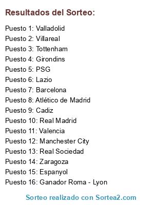 Lista de participantes: Valladolid, Lazio, Manchester City, Cadiz, Villareal, Girondins, Barcelona, Zaragoza, Ganador Roma - Lyon, Tottenham, Real Sociedad, Valencia, PSG, Espanyol, Real Madrid, Atlético de Madrid.