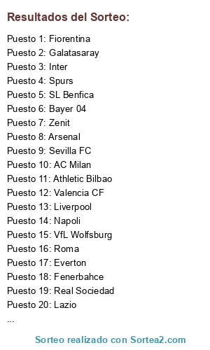 Lista de participantes: Bayer 04, FC Schalke 04, VfL Wolfsburg, Athletic Bilbao, Atletico Madrid, Real Sociedad, Sevilla FC, Valencia CF, Arsenal, Everton, Liverpool, Spurs, AC Milan, Fiorentina, Inter, Lazio, Napoli, Roma, FC Porto, SL Benfica, Zenit, Fenerbahce, Galatasaray.