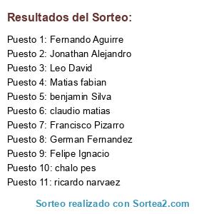 Lista de participantes: Matias fabian, Jonathan Alejandro, Leo David, Felipe Ignacio, German Fernandez, Francisco Pizarro, ricardo narvaez, benjamin Silva, claudio matias, Fernando Aguirre, chalo pes.