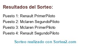 Lista de participantes: Renault PrimerPiloto, Renault SegundoPiloto, Mclaren PrimerPiloto, Mclaren SegundoPiloto.