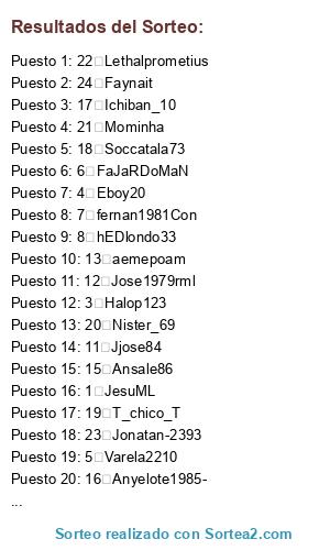 Lista de participantes: 1 JesuML, 2 Rowy10gonjim, 3 Halop123, 4 Eboy20, 5 Varela2210, 6 FaJaRDoMaN, 7 fernan1981Con, 8 hEDlondo33, 9 Xchiky3x, 10 Xou86, 11 Jjose84, 12 Jose1979rml, 13 aemepoam, 14 Ginman1986, 15 Ansale86, 16 Anyelote1985-, 17 Ichiban_10, 18 Soccatala73, 19 T_chico_T, 20 Nister_69, 21 Mominha, 22 Lethalprometius, 23 Jonatan-2393, 24 Faynait.