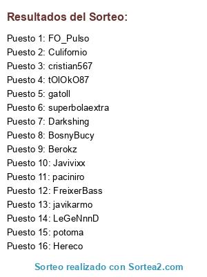 Lista de participantes: tOlOkO87, BosnyBucy, Darkshing, FO_Pulso, Berokz, FreixerBass, Javivixx, LeGeNnnD, Hereco, potoma, superbolaextra, javikarmo, gatoll, cristian567, Culifornio, paciniro.
