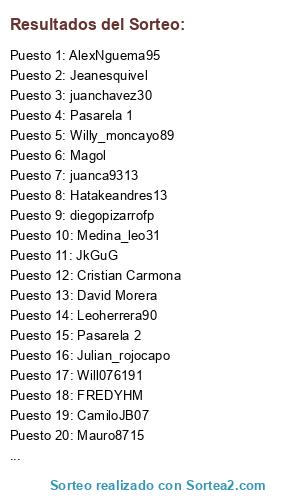 Lista de participantes: Diego Botero, Hatakeandres13, JECuesta, juanca9313, juanchavez30, Juansebas7, Lalo Romero, Supersayayo8808, Will076191, Willy_moncayo89, David Morera, diegopizarrofp, CamiloJB07, FREDYHM, Jeanesquivel, Medina_leo31, AlexNguema95, JkGuG, Julian_rojocapo, Leoherrera90, Leo caldas, Magol, Cristian Carmona, Mauro8715, Pasarela 1, Pasarela 2.