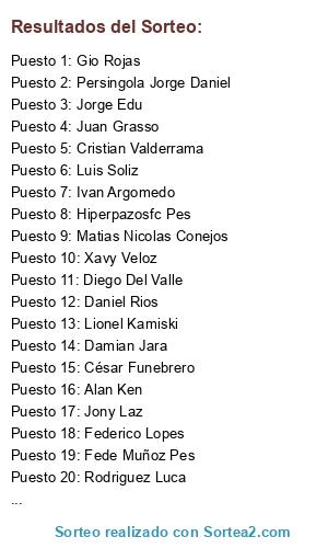 Lista de participantes: Hiperpazosfc Pes, Jony Laz, Martin Pradal, Sergio Daniel Tovar, Juan Grasso, Ciros Atineos, Matias Nicolas Conejos, Luis Soliz, Pedrojafet Rivera, Cristian Valderrama, Dario Bertinatti, Federico Lopes, Luis Nuñez, Juan Camilo Zuluaga, Arii Ledesma, Gio Rojas, César Funebrero, Rodriguez Luca, Daniel Rios, Luis Franco, Wilson Quiroz Aguilera, Alan Ken, Persingola Jorge Daniel, Xavy Veloz, Roguer Caamaño Contreras, Gustavo Olmedo, Alejo Molina, Jorge Edu, Dario Ezequiel, Damian Jara, Fede Muñoz Pes, Lionel Kamiski, Diego Del Valle, Ivan Argomedo.