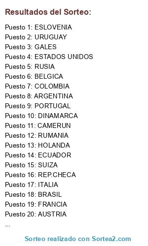 Lista de participantes: ESPAÑA, ALEMANIA, BRASIL, FRANCIA, ARGENTINA, PORTUGAL, BELGICA, ITALIA, INGLATERRA, HOLANDA, URUGUAY, MEXICO, SUIZA, POLONIA, CHILE, COLOMBIA, TURQUIA, RUSIA, DINAMARCA, AUSTRIA, COSTA DE MARFIL, GALES, GRECIA, ESTADOS UNIDOS, SUECIA, CAMERUN, ESLOVENIA, REP.CHECA, ECUADOR, SUDAFRICA, RUMANIA, RP. CHINA.