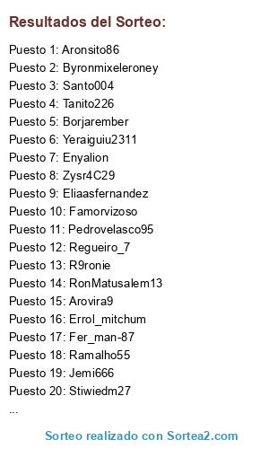Lista de participantes: Marjaivan, Isma123i, Byronmixeleroney, Tanito226, Regueiro_7, Famorvizoso, Eliaasfernandez, Pabloggv, Ankibusa, Pedrovelasco95, R9ronie, Zysr4C29, Furru_asesino21, Spain_Kiko, J_murcia, Stiwiedm27, Pelito10, Juangutierrez91, Gysan_CLS, Yeraiguiu2311, Enyalion, Pelizelli, IvaanM95, Arovira9, Facio7, Egimendia99, BorjaRT13, Betito22, Ramalho55, Locobielsa89, Jemi666, Peppuz07, Sacisto, Borjarember, Errol_mitchum, RonMatusalem13, Aronsito86, esparta087, Fer_man-87, Santo004.