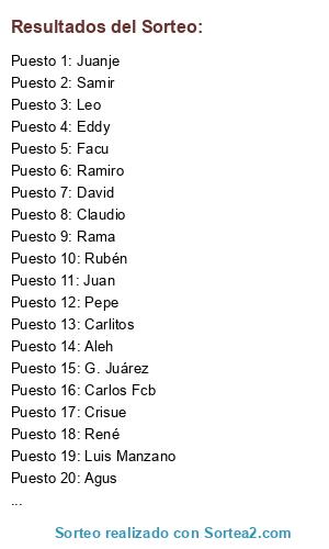 Lista de participantes: Daza, Rama, David Nicolás, Eddy, Agus, Aleh, Carlitos, Claudio, David, Carlos Fcb, Eltan, G. Juárez, Gusin, Leo, Luis Manzano, Nicola, Pato, Pepper, Pepe, Ramiro, René, Rubén, Robra, Souza, Juanje, Juan, Facu, Crisue, Felipe, Martin, Samir, Rei Ayala.