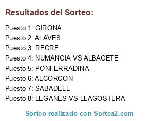 Lista de participantes: LEGANES VS LLAGOSTERA, NUMANCIA VS ALBACETE, PONFERRADINA, GIRONA, SABADELL, RECRE, ALCORCON, ALAVES.