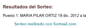 Lista de participantes: FRANCISCA GALAN 17 dic, 2012 a las 10:28, marta 21 diciembre, 2012 a las 14:56, maria jose martin 17 dic 2012 a las 10:38, María fg 17 diciembre, 2012 a las 10:39, Ana María González 17 dic, 2012 a las 11:25, lola ceballos 17 diciembre, 2012 a las 11:26, yolanda 17 diciembre, 2012 a las 11:40, Mar 17 diciembre, 2012 a las 11:56, Ana Belén Martín 17 dic, 2012 a las 12:08, Ana Breña 17 diciembre, 2012 a las 12:10, esther garcia retortillo 17 dic 2012 a las 13:07, Maria Jose 17 diciembre, 2012 a las 13:29, Zulema Pontes Vidal 17 dic, 2012 a las 13:29, Gema 17 diciembre, 2012 a las 13:30, Cris 17 diciembre, 2012 a las 13:37, mallirubi 17 diciembre, 2012 a las 13:56, gemma 17 diciembre, 2012 a las 13:58, Monica 17 diciembre, 2012 a las 14:41, Ana Maria 17 diciembre, 2012 a las 16:07, ana 17 diciembre, 2012 a las 16:25, Cristina 17 diciembre, 2012 a las 16:31, Rosa Maria 17 diciembre, 2012 a las 19:44, MARIA PILAR ORTIZ 18 dic, 2012 a las 8:48, Ana Fernandez 18 dic, 2012 a las 11:20, Puerto Rodriguez 18 dic, 2012 a las 12:26, leyre 18 diciembre, 2012 a las 12:44, Marta Muñoz 18 diciembre, 2012 a las 22:50, ELIA 19 diciembre, 2012 a las 10:31, sonia sobrino 19 dic, 2012 a las 13:28, M.Pilar 19 diciembre, 2012 a las 16:19, lis 19 diciembre, 2012 a las 18:35, Alicia 19 diciembre, 2012 a las 23:24, tania 20 diciembre, 2012 a las 17:23, lorena 20 diciembre, 2012 a las 18:15, PAQUITA 21 diciembre, 2012 a las 10:40, MAR 21 diciembre, 2012 a las 10:43, Isamar dice 21 diciembre, 2012 a las 12:22, susana 21 diciembre, 2012 a las 16:45, laura pujal 21 diciembre, 2012 a las 17:39, Maria Salud Pérez 21 dic, 2012 a las 22:21.