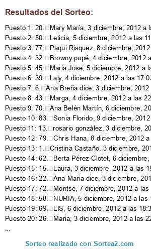 Lista de participantes: 1. Cristina Castaño, 3 diciembre, 2012 a las 11:17, 2. MARIA DOLORES , 4 diciembre, 2012 a las 16:15, 3. RAQUEL dice, 5 diciembre, 2012 a las 12:45, 4. Aneta, 3 diciembre, 2012 a las 11:18, 5. bibi dice, 3 diciembre, 2012 a las 11:22, 6. Ana Breña dice, 3 diciembre, 2012 a las 11:25, 7. Natalia Toro Covelo, 3 diciembre, 2012 a las 12:25, 8. Puerto Rodriguez, 3 diciembre, 2012 a las 12:29, 9. Alicia, 3 diciembre, 2012 a las 13:37, 10. Laura dice, 3 diciembre, 2012 a las 13:44, 11. Bea, 3 diciembre, 2012 a las 14:00, 12. mariam zarrouk, 3 diciembre, 2012 a las 14:05, 13. rosario gonzález, 3 diciembre, 2012 a las 14:21, 14. Cris, 3 diciembre, 2012 a las 14:29, 15. Laura, 3 diciembre, 2012 a las 15:21, 16. Beatriz, 3 diciembre, 2012 a las 15:41, 17. Victoria, 3 diciembre, 2012 a las 16:30, 18. María, 3 diciembre, 2012 a las 17:47, 19. Elena Mesa, 3 diciembre, 2012 a las 18:53, 20. Mary María, 3 diciembre, 2012 a las 20:49, 21. Elena. 3 diciembre, 2012 a las 21:23 (Editar), 22. Ana Maria dice, 3 diciembre, 2012 a las 21:37, 23. maria Jose mora, 3 diciembre, 2012 a las 21:45, 24. Isabel, 3 diciembre, 2012 a las 22:10, 25. Mª Isabel, 3 diciembre, 2012 a las 22:15, 26. Maria, 3 diciembre, 2012 a las 22:44, 27. Zulema Pontes, 3 diciembre, 2012 a las 23:18, 28. LEYRE, 4 diciembre, 2012 a las 9:20, 29. Belen, 4 diciembre, 2012 a las 9:49, 30. Marilo, 4 diciembre, 2012 a las 10:39, 31. gutidelmazo, 4 diciembre, 2012 a las 11:52, 32. Browny pupé, 4 diciembre, 2012 a las 13:44, 33. Stylefortheweekend, 4 dic, 2012 a las 13:55, 34. Maris Jose, 4 diciembre, 2012 a las 14:53, 35. Ana María Martínez, 4 dic, 2012 a las 15:10, 36. Aitana Carvajal, 4 diciembre, 2012 a las 15:21, 37. chelo dice, 4 diciembre, 2012 a las 15:48, 38. maria jose martin, 4 diciembre, 2012 a las 15:57, 39. Laly, 4 diciembre, 2012 a las 17:03, 40. Yoly, 4 diciembre, 2012 a las 17:11, 41. Elia, 4 diciembre, 2012 a las 20:16, 42. Noelia dice, 4 diciembre, 2012 a las 21:04, 43. Marga, 4 diciembre, 2012 a las 22:07, 44. Karina Ceballo, 4 diciembre, 2012 a las 22:30, 45. Maria Jose, 5 diciembre, 2012 a las 7:38, 46. sonia sobrino, 5 diciembre, 2012 a las 9:16, 47. Rosa Sorroche, 5 diciembre, 2012 a las 10:18, 48. Alfonso Herrera, 5 diciembre, 2012 a las 10:31, 49. Maria, 5 diciembre, 2012 a las 11:05, 50. Leticia, 5 diciembre, 2012 a las 11:57, 51. Raquel, 5 diciembre, 2012 a las 12:47, 52. ana calvo, 5 diciembre, 2012 a las 12:58, 53. Eva R dice, 5 diciembre, 2012 a las 13:36, 54. Laura, 5 diciembre, 2012 a las 15:13, 55. Julia, 5 diciembre, 2012 a las 16:15, 56. Nenitapg, 5 diciembre, 2012 a las 16:17, 57. Lucía, 5 diciembre, 2012 a las 19:42, 58. NURIA, 5 diciembre, 2012 a las 19:58, 59. Ana Fernandez, 5 diciembre, 2012 a las 20:05, 60. Maria Coronada, 5 diciembre, 2012 a las 22:25, 61. Lidia Louzao, 6 diciembre, 2012 a las 4:22, 62. Berta Pérez-Clotet, 6 diciembre, 2012 a las 7:18, 63. Laura dice, 6 diciembre, 2012 a las 8:11, 64. Graciela Paz, 6 diciembre, 2012 a las 8:21, 65. Yolanda, 6 diciembre, 2012 a las 10:22, 66. Belen, 6 diciembre, 2012 a las 11:05, 67. Isabel Gragera, 6 diciembre, 2012 a las 11:47, 68. Virginia, 6 diciembre, 2012 a las 13:38, 69. LIS, 6 diciembre, 2012 a las 18:34, 70. Ana Belén Martín, 6 diciembre, 2012 a las 20:11, 71. Gemma Fab, 7 diciembre, 2012 a las 10:03, 72. Montse, 7 diciembre, 2012 a las 12:05, 73. Maria da Graça Victória, 7 dic, 2012 a las 16:41, 74. Gemma, 7 diciembre, 2012 a las 18:40, 75. Encarna, 7 diciembre, 2012 a las 20:24, 76. ayna trotamundos, 8 diciembre, 2012 a las 11:26, 77. Paqui Risquez, 8 diciembre, 2012 a las 17:30, 78. maria jose quiles, 8 diciembre, 2012 a las 17:38, 79. Chris Hana, 8 diciembre, 2012 a las 22:59 (Editar), 80. Carolina Velázquez, 8 diciembre, 2012 a las 23:37, 81. Inma Cervera, 8 diciembre, 2012 a las 23:42, 82. gloria bes, 8 diciembre, 2012 a las 23:42, 83. Sonia Florido, 9 diciembre, 2012 a las 7:00, 84. Francisca Galan, 9 diciembre, 2012 a las 8:50, 85. Ana, 9 diciembre, 2012 a las 10:02, 86. Little Sae, 9 diciembre, 2012 a las 15:10, 87. Sonia, 9 diciembre, 2012 a las 16:09, 88. Joana Sanchez, 9 diciembre, 2012 a las 20:50.