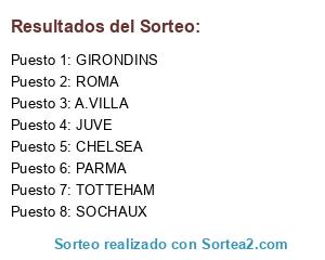 Lista de participantes: JUVE, CHELSEA, A.VILLA, PARMA, GIRONDINS, ROMA, SOCHAUX, TOTTEHAM.
