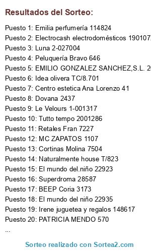 Lista de participantes: Retales Fran 7279, Confecciones Aurelio 669, Confecciones Aurelio 668, Librería el principito 4731, Papelería, librería, regalos Pascual Duarte 12006, Retales Fran 7437, Le Velours 1-001298, Le Velours 1-001299, Pradoplantel 0/9392, Floristería Ana 3999, DOVANA 2328, Librería naroga 202006085, Librería el principito 4732, Milenium 5680523880, COLORIN COLORADO 2 002730, RETALES FRAN 6898, A & D ALONSO S.C 17561, A&D ALONSO. S.C 17608, Sanguilinda retales 44904, Retales Fran 7150, Multiopticas 7295, Gandarias 167398, Cronos 260363, Gandarias 167399, La esquina de las delicias 6236, Nieves Díaz González 90798, Sebastián Carrasco Delgado 1P 001384, Superdroma 28360, Luna 2-026983, Casita de lara 1165, Nutrickon mascotas 74898, naroga 3683, Eva Reyes 337, Eva Reyes 338, Eva Reyes 339, Eva Reyes 340, Fruteria Mercadito T0009, Retales Fran 7458, MC ZAPATOS/COMPLEMENTOS 1006, Retales Fran 7459, Idea olivera TC8633, LIBRERIA NAROGA 202006169, La esquina de las delicias 6235, Frutería Mercadito M2-T0011, Jugueteria pamda 1541, Jugueteria pamda 1540, Calzados Bernar 23131, Juguetería pamda 1539, Farmacia 336. María Rocio Tobajas Pizarro D- 070044, naroga 3684, A&D MODA INFANTIL 17574, MERCERIA Y LENCERIA LABORES 90779, Luna 2-026984, Retales fran 7464, Idea olivera TC8634, A&D moda infantil 17607, Dovana 2449, Emilio Gonzalez Sanchez 200008352, Patricia Mendo 558, Luna 2-026986, Modimela 20/10269, IDEA OLIVERA TC/8.571, Papelería librería regalos pascual duarte 11960, Egumen peluqueros 49140, LIBRERIA NAROGA 202006171, Emilia perfumería 114802, Luna 2-026987, Farmacia María Rocio Tobajas Pizarro D-070013, IDEA OLIVERA TC8637, Domingo Viste VIS/26458, Confecciones Aurelio 706, Estética Lidia Sánchez FS01-22, LIBRERIA NAROGA 202008172, Dovana 2450, Abracadabra 2716, Aurelio 691, LIBRERIA NAROGA 202006173, Juguetería pamda T20/1544, Colorín Colorado 2760, Egumen peluqueros 49055, Karpint TAR-1392, Tienda Polo TC5/82711, Jugueteria pamda 1543, Federopticos Lenticor T20671, Foto Karpint T20-39548, Tienda Polo TC5/82712, Nutricion mascotas 74902, Decorami V. García 7370, Abracadabra 2717, Gandarias 167400, DOVANA 2452, LIBRERIA NAROGA 202006176, Juguetería pamda 1546, Eva Reyes Moda y Complementos 363, Tienda POLO Tc5/82713, Esencias 2 OO3139, Idea olivera TC 8641, Farmacia Rocío Tobajas Pizarro D-070269, Librería el principito 4756, LIBRERIA NAROGA 202006177, Juguetería Pamda T20/1542, Juguetería pamda 1547, Egumen Peluqueros 49174, Teresa Mayo 28120, Juguetería pamda 1445, A & D 17681, Peluquería Bravo Inés 645, Librería el principito 4762, Librería El Principito 4757, Ekectrocash 72920, Flichi shop 1132, Cortinas Molina 7466, Electrocash 72892, Coquetos 2-002725, Retales Fran 7117, Retales fran 7118, Dovana 2453, Lámparas isabel 32, Jugueteria Irene 000004*14/12/2020, Nutrición mascotas Tk/74897, Dovana 2454, Sensación digital S20/000000011890, Sensación digital S20/000000011889, Jugueteria pamda 1548, Fco. Javier Martín sanchez 7, A&D 17684, Idea olivera 8636, Nutricion mascotas 74903, Electrocash 72926, Confecciones Aurelio 709, Jugueteria Pamda 1549, A&D MODA INFANTIL 17682, Electrocash 72919, Confecciones Aurelio 708, Gandarias 167401, Librería El principito 4764, Confecciones Aurelio 713, Flichi shop 1141, Librería El principito 4765, Bellafarma 4135, Dovana 2455, Los Malagueños T20/724, Juguetería pamda 1552, Retales fran 7492, Eva reyes moda y complementos 365, Pinturas MONCAR 4533, NAROGA 3685, Cortinas Molina 4286, La esquina de las delicias 6242, Juguetería pamda 1553, Miren 10005555, Patricia Mendo 559, NAROGA 3686, Tienda Polo TC5/82710, Le velours 1001304, Juegueteria pamda 1554, Lámparas Isabel 35, Luna 2-026989, Patricia Mendo 561, Patricia Mendo 560, Tienda POLO Tc5/82715, Confecciones Aurelio 714, ropa infantil ollero 10016409, Bellafarma 4037, Abracadabra 2719, Gandarias 259032, Lámparas Isabel 33, Nutrición Mascotas TK/74906, Le velours 1-001301, Confecciones Aurelio 715, Tienda Polo TC5/82716, LIBRERIA NAROGA 202006179, A&D 17688, Juguetería pamda 1535, Esteticien Ana Lorenzo 31, ropa infantil ollero 10016411, Idea coria TC 8645, calzados Bernar 23133, Libreria Naroga 3687, Retales Fran 7509, Retales Fran 7504, Dovana 2457, ropa infantil ollero 10016412", Papelería Alonso 0001 14/12/2020, Electricash 72931, Tienda POLO Tc5/82717, Estética Lidia Sanchez FS01-19, Retales Fran 7373, naroga 3688, Superdroma 28379, Pinturas MONCAR 4537, Idea olivera 8638, Idea olivera TC 8650, BellaFarma 4147, Miren 5557, dovana 2460, Calzados bernar 23135, Calzados Bernar 23136, Comercial Pacheco 1-001279, Milenium 5680526280, Milenium 5680526270, Muebles Decorami V. García 7371, Naroga 202006185, Superdroma 28384, PATRICIA MENDO HERNÁNDEZ VEN/559, PATRICIA MENDO HERNÁNDEZ 560, PATRICIA MENDO HERNANDEZ 561, Irene. Juguetes -regalos 148573, Superdroma 28385, Electrocash 72935, Retales fran 7528, Retales fran 7529, Abracadabra 2718, Librería naroga 202006181, Milenium 5680524860, Emilia perfumería 115137, El mundo del niño 22821, Juguetería Pamda T20/1558, Librería Pascual Duarte 12038, NUTRICION MASCOTAS 74908, Explotaciones integrales la nava SLU D-018039, Pascual duarte 11923, Juguetería panda T20/1457, El mundo del niño 22752, Bellafarma 19/4138, Retales fran 7326, Emilia perfumería 115067, Emilia perfumería 114824, Emilia perfumería 114825, Electrocash 2019014266, Estetica Lidia sanchez FS01-11, A&D Alonso S.C. 17691, FRUTERÍA MERCADITO 65, FRUTERÍA MERCADITO 64, Miren 10005558, Juguetes Irene 148416, El mundo del niño 22639, Dovana 2326, Electrocash 72912, Electrocash 72856, Fruteria mercadito 78, Electrocash 72928, A&D ropa infantil 17577, Pinturas moncar 2-004529, El mundo del niño 22823, MC zapatos 1046, Retales Fran 7488, Papelería Alonso 2, A&D MODA INFANTIL 17670, Polo TC5/82678, Egumen 49213, Farmacia Mercedes Pascual Echávarri D-017917, Mercería Labores 90789, Miren 10005448, Librería Pascual Duarte 
