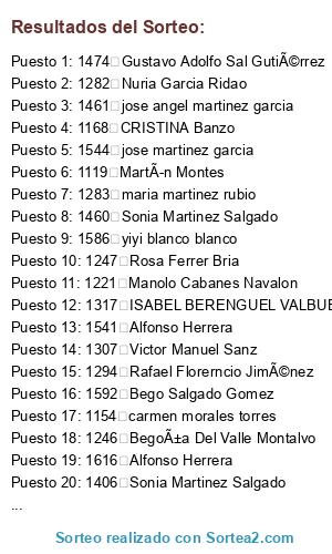 Lista de participantes: 1053 sergio ramos, 1055 Laura GarcÃa Ãlvarez, 1056 CELIA AGUILERA AYLLÓN, 1057 pilar bosch nicolau, 1058 Corina DIez Triguero, 1108 fernando calderon alaminos, 1109 jose david garcia lopez, 1110 jose david cebrian perez, 1111 Danny Diaz Merino, 1112 JUAN CARLOS INSA GRAU, 1113 PATRICIA oliveira alves, 1114 Jose Antonio Guio Rey, 1115 PIGALLE ELBAR, 1116 MONICA OROZCO BAENA, 1117 cafeteria Bogart, 1118 helena canovas moreno, 1119 MartÃn Montes, 1120 Elena M Testera Arias, 1121 Eduardo Lopez Ortega, 1122 raul muñoz pesquera, 1123 Santiago rico corcoles, 1124 Francisco de Borja Segovia Segovia, 1125 Francisco Rafael Afonso AlegrÃa, 1126 Diego Vázquez Gómez, 1127 Adelino Leite Ben, 1128 Cristina Otero, 1129 Aitor González Castel, 1130 Juan José Palacios GarcÃa, 1131 Tomas Rodrigo Fernandeza, 1132 DANIEL APARICIO SERRANO, 1133 Iñigo Villagrán Yáñez, 1134 Elena Hernandez Sanchez, 1135 Elena Maria Testera Arias, 1136 Eduardo Lopez Ortega Mancera, 1137 Alba Sánchez Lara, 1138 Carlos Blanco Alvarez, 1139 MIKEL CANTERO, 1140 Maria Garrido Ãlvarez, 1141 Pablo Hernandez Martin, 1142 ignacio, 1143 Sergio Andrés Cano, 1144 Pepe Alonso, 1145 ROBERTO ANDRES CANO, 1146 Iñigo Villagrán Yáñez, 1147 ALBERTO ORTEGA RIVAS, 1148 jesus alisente castro, 1149 inma perez pastor, 1150 sofia sanchez peÅ„a, 1151 rocio fraga martinez, 1152 marisa peña sanchez, 1153 jaime redondo saez, 1154 carmen morales torres, 1155 Carmen Castellano Juárez, 1156 Carmen Castellano Juárez, 1158 Mª del Pilar Castillo Porras, 1159 susana beatriz rivero denk, 1160 José Luis membrillo solis, 1161 monica lastra, 1162 Julio Roman Hierro, 1163 francisca garcia oliva, 1164 esther quuiñones, 1165 jesus rodriguez granado, 1166 Nuria MacÃas GarcÃa, 1167 Luis Maria Bartolomé Bartolomé, 1168 CRISTINA Banzo, 1169 Borja Manrique Plaza, 1170 Manuel MacÃas RamÃrez, 1171 mari carmen martin fernandez, 1172 Silvia Bartolome MacÃas, 1173 ana luisa martin marrero, 1174 Victoria GarcÃa Perea, 1175 Guillermo Thomas de Carranza, 1176 JULIO BARTOLOME BARTOLOME, 1177 orosia sotelo siria, 1178 MIGUEL ANGEL JAREÑO MUÑOZ, 1179 MIGUEL ANGEL JAREÑO MUÑOZ, 1180 PILAR PEREZ GARCIA, 1181 beatriz val valentin, 1182 Beatriz Val Valentin, 1184 Juan Carballal, 1186 Jaime B Torralba, 1187 ana luisa martin marrero, 1188 monica torres mariscal, 1189 Encarnación Gullón Arias, 1190 Joaquin Olmedo de la Guia, 1191 jonathan hernandez guzman, 1192 Alfonso Herrera Rodriguez, 1193 Carolina Viola, 1194 alba sanchez cano, 1195 Aurora Marques Torres, 1196 Amparo Tomas Asensio, 1197 miguel sola garcia, 1198 NATALIA DIAZ GONZALEZ, 1199 Emilia Pozas MarÃn, 1202 Emilio Ãlvarez RodrÃguez, 1204 Julio Pareja Cariñana, 1205 patricia beneite garcia, 1206 Manuel Ruiz Garcia, 1207 Alberto Vidal Troitiño, 1208 Miriam Gómez Pavón, 1209 Maria Asuncion Gullon Arias, 1210 MANOLO JIMENEZ ARROYAL, 1211 E Jose Alvarez, 1212 Beatriz Val Valentin, 1213 Juan Manuel Tinoco Muñiz, 1214 jesus gomez grosso, 1215 Davide Michiamano, 1216 Manolo Jimenez Arroyal, 1217 Miguel Angel Jareño Muñoz, 1218 Carmen Estraviz Varela, 1219 Nuria MacÃas G, 1220 Manuel Ruiz GarcÃa, 1221 Manolo Cabanes Navalon, 1222 Maria Asuncion G Arias, 1223 francisco antonio monfillo perles, 1224 Lucia Cabado Lopez, 1225 antonio martos escudero, 1226 juana castro cesar, 1227 joan carles mateu carrera, 1228 SONIA FLORIDO JIMENEZ, 1229 Mª del Valle Fernandez Ximenez de Cisneros, 1232 Moisés Goás González, 1233 BEGOÑA DEL VALLE MONTALVO, 1234 Arantxa Sanchez, 1235 Santiago Cabado Estraviz, 1236 Carolina Peña, 1237 Aurora Aida Goas Castro, 1238 Aurora Castro Luaces, 1239 mari carmen romero quintero, 1240 Corina Diez, 1241 Aura He. Go., 1242 Alba Maria Gonzalez Muñoz, 1243 Encarni Sanchez Alanis, 1244 MarÃa Carmen López Coto, 1245 Elena Knyazhechenko, 1246 Begoña Del Valle Montalvo, 1247 Rosa Ferrer Bria, 1248 David Garcia Calvente, 1249 Maria Guerrero, 1250 Federico David Garcia, 1251 Daviliyo Garcia, 1252 Pepi Calvente, 1253 Deivid Garcia, 1254 Maria Angeles Leon, 1255 david garcia, 1256 Jose guerrero, 1257 Juan Pe, 1258 Juan David Garcia, 1259 David Garcia, 1260 Daniel David garcia, 1261 francisco garcia, 1262 David Garcia, 1263 Fernando david garcia, 1264 Luis David Garcia, 1265 Joao David Garcia, 1266 Jose David Garcia, 1267 Rafael Cordoba Casado, 1268 M Amparo Frasquet, 1269 Alfonso Herrera, 1270 Juan Collado, 1271 Carolina Peña, 1272 Carmen Luis, 1273 Albert Schneider, 1274 Teresa Salazar, 1275 Covadonga Reverte, 1276 aisha ramos, 1277 Rosa Ferrer Bria, 1278 Tatiana Cabado López, 1279 Héctor Nuñez Vilaboa, 1280 MarÃa Ysabel Mendoza Gómez, 1281 Abdelghani El Harrati, 1282 Nuria Garcia Ridao, 1283 maria martinez rubio, 1284 jesus navarro galvin, 1285 Teresa Salazar, 1286 igor zorriketa, 1287 Carolina Peña, 1288 Albert Schneider, 1289 Maria, 1290 Manuel Ruiz GarcÃa, 1291 Gonzalo Mongil, 1292 Pascual Aparicio Cantero, 1293 Susana López Cuevas, 1294 Rafael Florerncio Jiménez, 1295 Alex Giménez, 1296 Miguel Angel Pedrero Garcia, 1297 Juan Carlos Insa Grau, 1298 jose antonio, 1299 mariluz martin lopez, 1300 Julio Calzado Muñiz, 1301 david garcia de la fuente, 1302 marina davila moreira, 1303 assuntagambi, 1304 David Rodriguez Rios, 1305 alejandro pita mendez, 1306 virginia cangueiro jiménez, 1307 Victor Manuel Sanz, 1308 juan carlos, 1309 Laura GarcÃa MartÃn, 1310 Mayte GarcÃa Lafuente, 1311 JOSE BERMUDEZ AVILA, 1312 Helena Canovas, 1313 Asuncion Ortega del Valle, 1314 Paula Menendez Rodriguez, 1315 Mª CARMEN PEÑA GOMEZ, 1316 Juan José Fiol Ojanguren, 1317 ISABEL BERENGUEL VALBUENA, 1318 Manuel Lucena Córdoba, 1319 Isaac Castejón Gómez, 1320 Alberto Vidal, 1321 Carmen Gomez Grosso, 1322 ines diaz gomez, 1323 Miguel Angel Jareño Muñoz, 1324 jesus manuel gonzalez romero, 1325 AdeAlino Leite Ben, 1326 Alvaro Caparros Ruiperez, 1327 Teresa Salazar, 1328 Sebastià Torres Callejero, 1329 Juan Collado, 1330 Carolina Peña, 1331 Eduardo Lopez