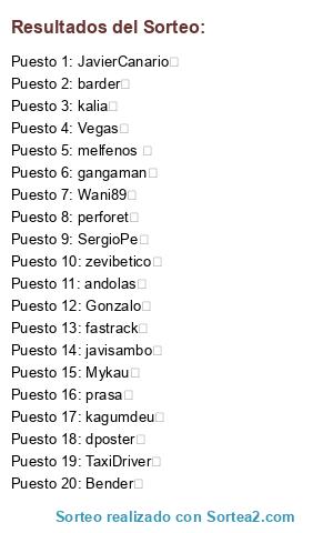 Lista de participantes: JavierCanario (5 participaciones), melfenos (4 participaciones), andolas (3 participaciones), Wani89 (2 participaciones), SergioPe (2 participaciones), zevibetico (2 participaciones), kagumdeu (2 participaciones), barder (2 participaciones), Mykau (2 participaciones), javisambo (2 participaciones), kalia , TaxiDriver , perforet , gangaman , Gonzalo , fastrack , Vegas , Bender , prasa , dposter.