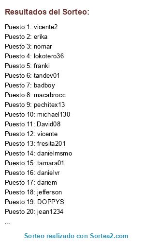 Lista de participantes: mamalo, DOPPYS, juarveas, badboy, juan90, vicente, vicente1, danielmsmo, LORDTOON, xicerium, jheremit, FOOLASTER, hecmig, dkwarrior8, roberth692, Kaluver, aldana1, franki, cassiel, erikgamer, psygamer, kempachi, elcriminal, EDERGUNJR, cazador50, erika, cazador52, cazador54, fresita201, EXTRIK007, vania, walgreimon, danielvr, tandev01, brak21, Vampilord, nicolas12, JUAN80, michael130, sliced21, sames, ryan, mrbwin, pacman, angkulitmo, MARCOAZL, jannet, gabo98, angkulit2, mago365, David08, lokotero36, dariem, michael120, SYNCMASTER, juan01, felixmag, vicente2, sergio1212, jefferson, jean1234, danieldani, javir1, zpokerz12, escalba, macabrocc, Soneric, xhaize, jackybilly, pechitex13, underworld, bobiita15, esnavas019, tamara01, hipo1234, nomar, hollow, ELBEXMEN, eddy29, david1, Gabriel412, antonix17, isis77, fercho25, lucifer345, calacangv.
