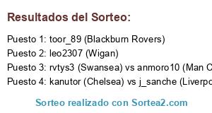 Lista de participantes: leo2307 (Wigan), rvtys3 (Swansea) vs anmoro10 (Man City), toor_89 (Blackburn Rovers), kanutor (Chelsea) vs j_sanche (Liverpool).