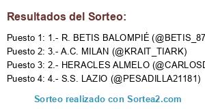 Lista de participantes: 1.- R. BETIS BALOMPIÉ (@BETIS_87), 2.- HERACLES ALMELO (@CARLOSDURAN0), 3.- A.C. MILAN (@KRAIT_TIARK), 4.- S.S. LAZIO (@PESADILLA21181).