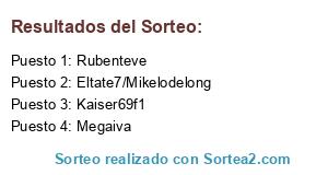 Lista de participantes: Megaiva, Kaiser69f1, Rubenteve, Eltate7/Mikelodelong.