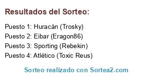 Lista de participantes: Eibar (Eragon86), Atlético (Toxic Reus), Sporting (Rebekin), Huracán (Trosky).