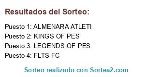 Lista de participantes: FLTS FC, LEGENDS OF PES, KINGS OF PES, ALMENARA ATLETI.