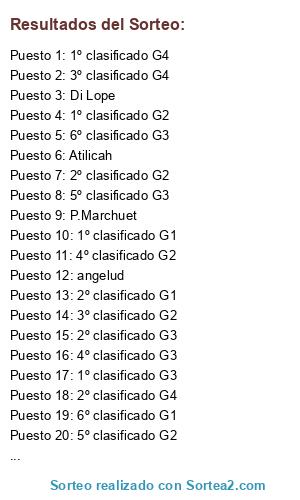 Lista de participantes: Atilicah, angelud, P.Marchuet, Di Lope, 1º clasificado G1, 1º clasificado G2, 1º clasificado G3, 1º clasificado G4, 2º clasificado G1, 2º clasificado G2, 2º clasificado G3, 3º clasificado G1, 3º clasificado G2, 3º clasificado G3, 2º clasificado G4, 3º clasificado G4, 4º clasificado G1, 4º clasificado G2, 4º clasificado G3, 5º clasificado G1, 5º clasificado G2, 5º clasificado G3, 6º clasificado G1, 6º clasificado G3.