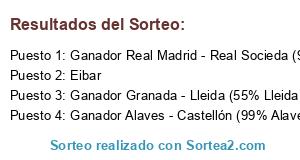 Lista de participantes: Eibar, Ganador Granada - Lleida (55% Lleida), Ganador Real Madrid - Real Socieda (99% Real Sociedad), Ganador Alaves - Castellón (99% Alavés).