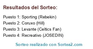 Lista de participantes: Sporting (Rebekin), Coruxo (Hill), Recreativo (JOSEDIN), Levante (Celtics Fan).