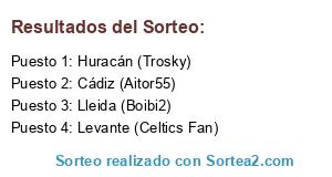 Lista de participantes: Levante (Celtics Fan), Cádiz (Aitor55), Lleida (Boibi2), Huracán (Trosky).
