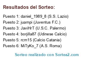 Lista de participantes: rcm15 (Calcio Catania), juampi (Juventus F.C.), borjilla87 (Udinese Calcio), JaviHrT (U.S.C. Palermo), MiTyKo_7 (A.S. Roma), daniel_1989_8 (S.S. Lazio).