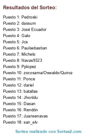 Lista de participantes: Ponce, Dasan, José Ecuador, batallas, Jca, dassum, Pplopez, Juansenavas, san_elv, Galo, dariel, Rendón, Paulsebastian, Pedroski, zocosama/Oswaldo/Quiroz, Jhonldu, Michelo, Navas9323.