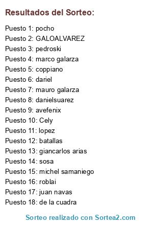 Lista de participantes: Cely, danielsuarez, dariel, pedroski, GALOALVAREZ, juan navas, batallas, mauro galarza, avefenix, lopez, coppiano, sosa, de la cuadra, michel samaniego, roblai, pocho, marco galarza, giancarlos arias.