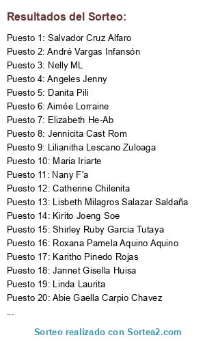 Lista de participantes: Ijmc Mi Vida, ShirleysiTa OnoFre, Michalle Shishido, Edita Castro, Janeth Garrido Palomino, Maria Iriarte, Lucia Aguilar, Olnkx Orzco, Verito Cordova, Jacky Lira, Catherine Chilenita, Angela Vasquez Torres, Roxana Pamela Aquino Aquino, Milagros Carrera, Antu Kath, Abie Gaella Carpio Chavez, Edith Aponte Pomasoncco, AdRii Odiaga, Xto Grazie, Maria Sulca P, Kirito Joeng Soe, Angeles Jenny, Danita Pili, Elizabeth He-Ab, Nelly ML, Jacqui Vasquez, Karitho Pinedo Rojas, Tanny Lizbeth ZP, Lilianitha Lescano Zuloaga, Kyara Aguilar, Jennicita Cast Rom, Salvador Cruz Alfaro, Nathaly Lua, Myriam Sg, Shirley Ruby Garcia Tutaya, Jannet Gisella Huisa, Paolita La Dulcecita, Maritabella Rosario, Allison Gutierrez Guanilo, Nany F'a, Linda Laurita, Qm Milagros Mirella, Cinthya Fards, GraCe Suarez Sànchez, Lisbeth Milagros Salazar Saldaña, Rocio PF Moran, Elvira Vásquez, André Vargas Infansón, Aimée Lorraine.