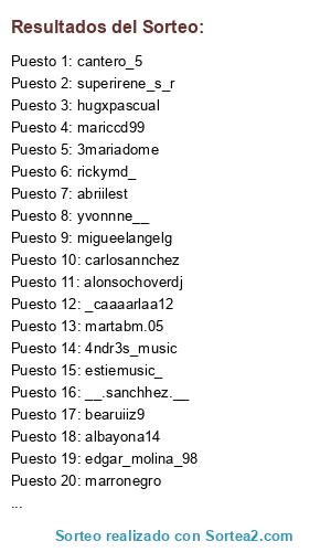 Lista de participantes: santibrisa(2), joansania(2), 3mariadome, alonsochoverdj(2), cantero_5(2), rickymd_(2), edgar_molina_98(3), marronegro(2), bearuiiz9, mariccd99, martabm.05(3), 4ndr3s_music(2), miirandaa31, migueelangelg(2), yvonnne__(4), estiemusic_(2), __.sanchhez.__(2), abriilest(2), _caaaarlaa12(3), carolineboaria, superirene_s_r(2), keeloke_, luciapiqueras_, mbm.photo, irenne1998, hugxpascual(2), esther_penaguila, albayona14(2), esma_photo28, beeatrizchico, carlosannchez(2), mireyags_.