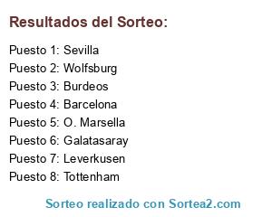 Lista de participantes: Leverkusen, Barcelona, O. Marsella, Wolfsburg, Burdeos, Sevilla, Tottenham, Galatasaray.